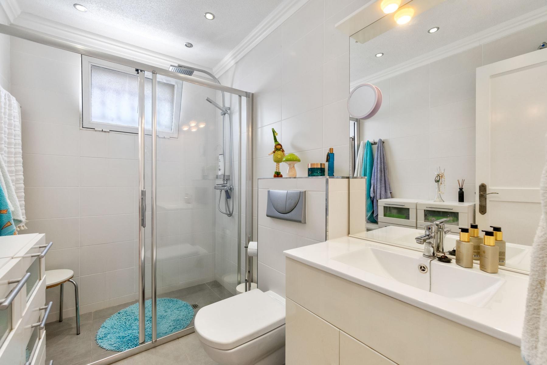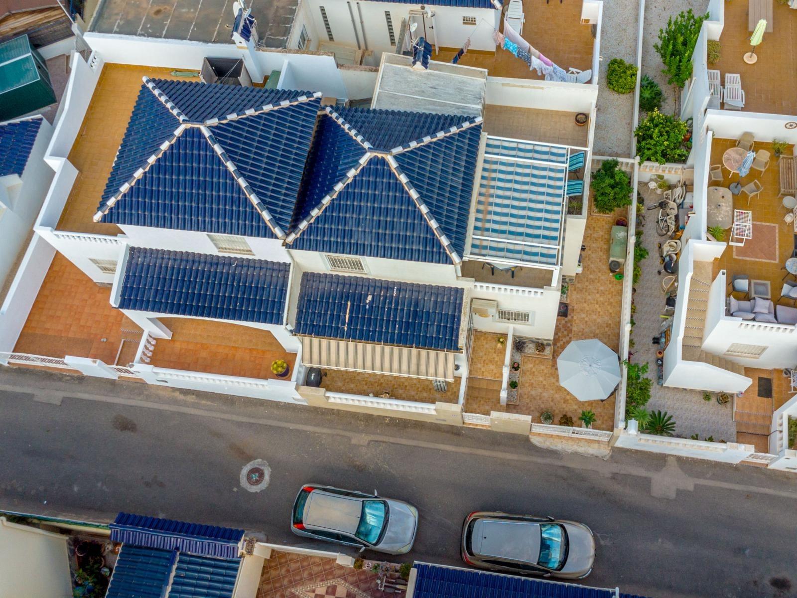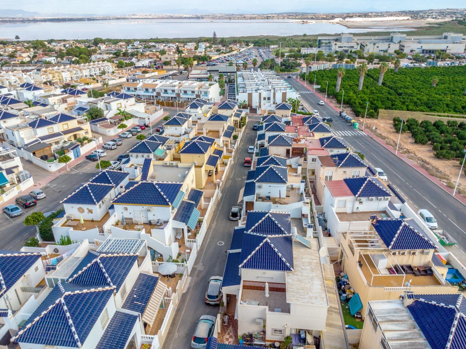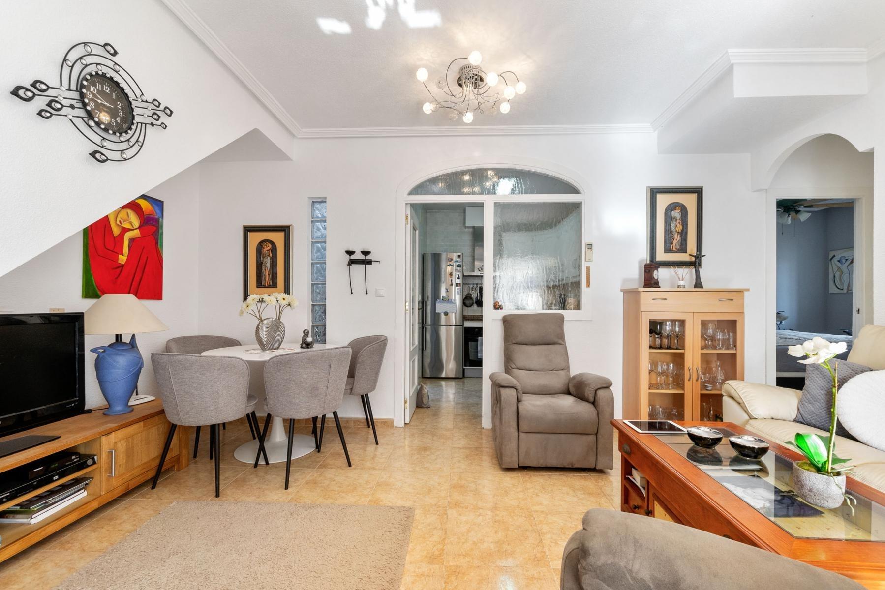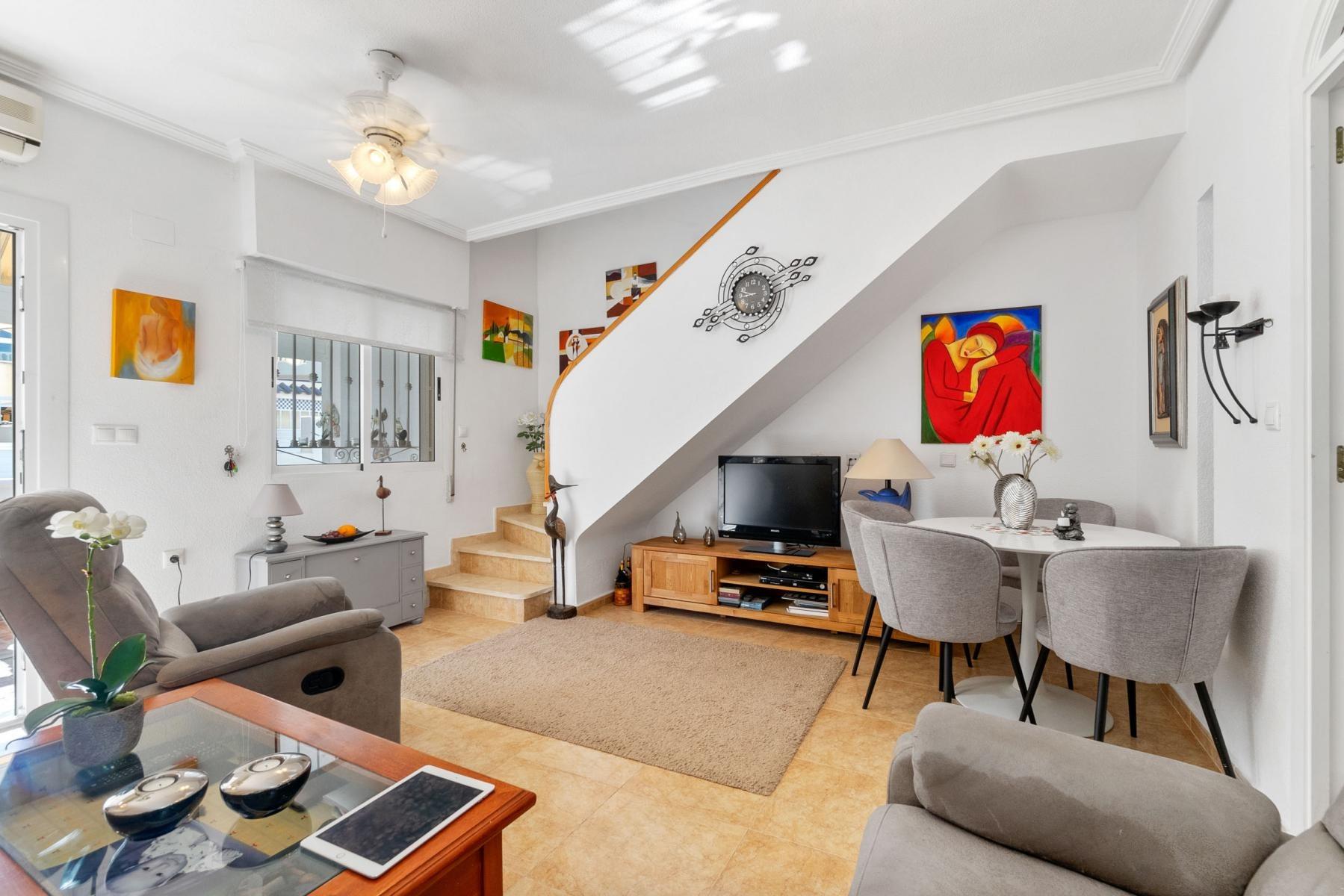 For sale: charming Quad-style home located in a quiet area of Torrevieja, within the Mirador de los Balcones II residential complex, surrounded by year-round residents and offering a friendly and welcoming atmosphere.~~The location is ideal, with all services close by: supermarkets, pharmacy, hospital, and Torrevieja’s beaches just minutes away.~~The residential complex features beautiful communal areas with an exclusive swimming pool for residents, perfect for enjoying the Mediterranean climate.~~Layout:~~Main floor: private garden with car entrance, covered porch/terrace, bright living-dining room, independent fully equipped kitchen, 2 bedrooms, and 1 full bathroom.~~Upper floor: additional bedroom with private bathroom, plus a large solarium terrace (partially covered and open), providing privacy and pleasant open views.~~The property has an excellent orientation, ensuring natural light all year round. It is sold fully furnished and equipped, ready to move into with no extra investment needed.~~Whether as a permanent residence or a holiday home, this is a great opportunity.~Don’t miss the chance to visit – contact us today. You’ll love it!~