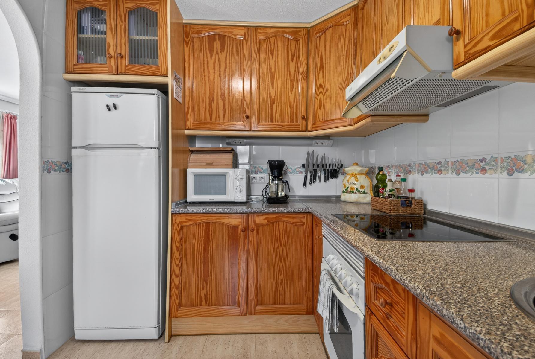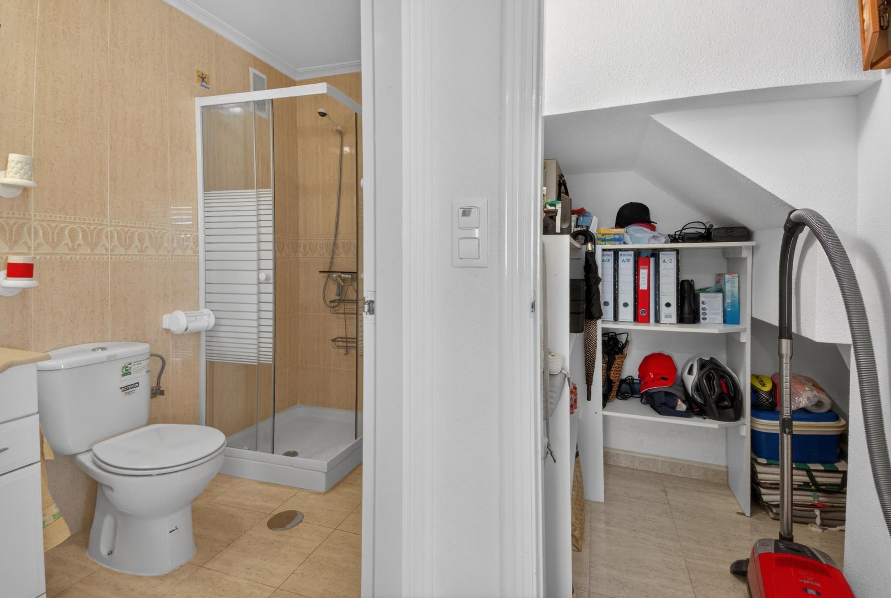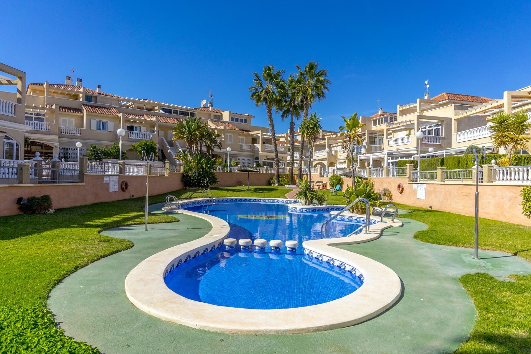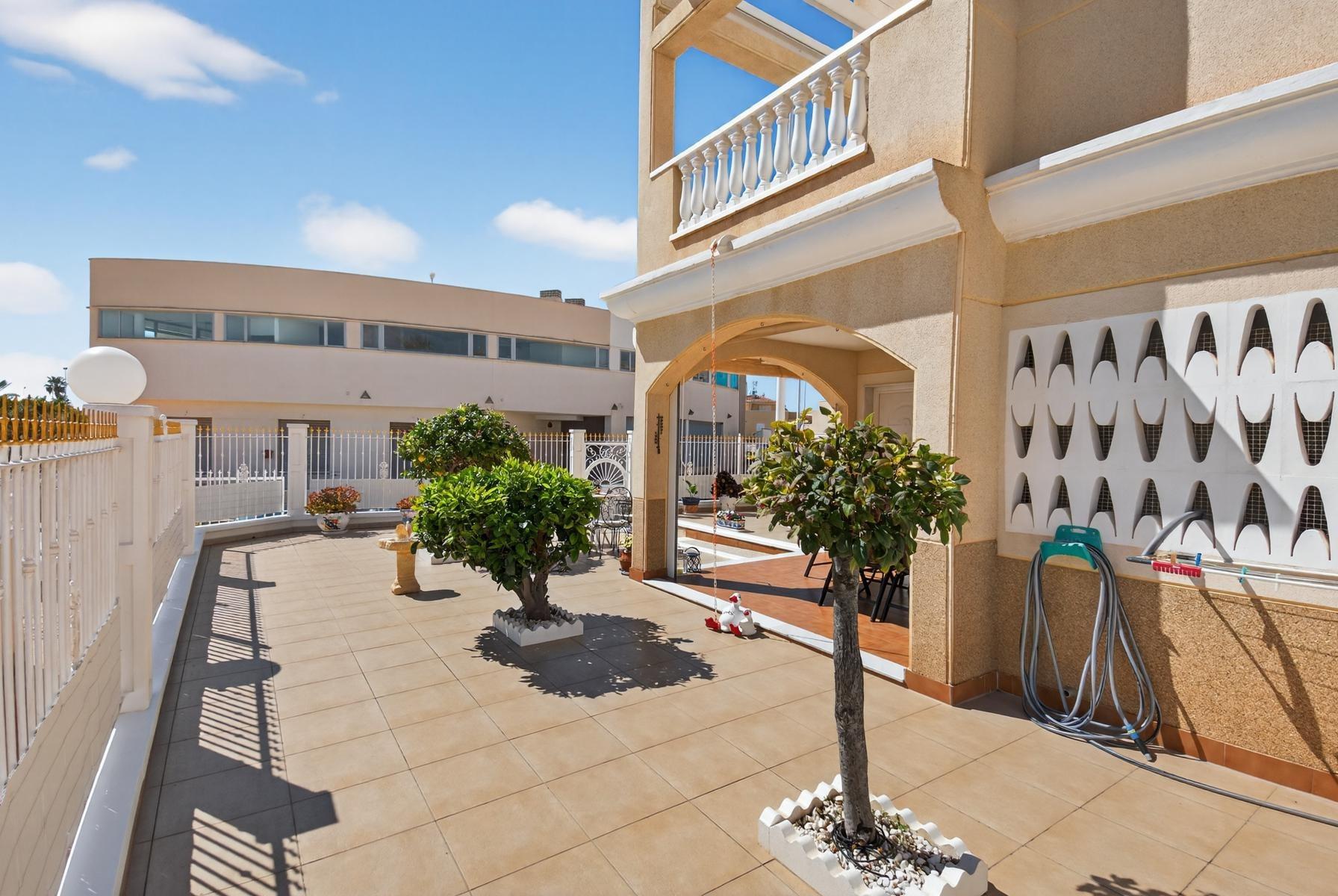 Corner Quad House, spread over two floors plus roof terrace with internal staircase, located just steps from the community pool in the established development Zeniamar V, Orihuela Costa. The property stands out for its brightness, comfort, and quiet environment, ideal as a main residence or for enjoying holidays.~~The community offers large landscaped areas, a big community pool, and a well-maintained environment, with excellent location close to supermarkets, cafés, restaurants, Zenia Boulevard, Playa Flamenca market, and the beaches of Orihuela Costa.~~On the ground floor, the house features a spacious covered terrace connected to the living room, a fully equipped open-plan kitchen with utility room, a bathroom, and a practical storage room, providing daily comfort and functionality.~~The first floor includes 2 bedrooms and 1 full bathroom, along with a glassed terrace and a sun terrace, perfect for relaxing and enjoying the sun.~~The roof-floor offers a multipurpose room, adaptable for storage, office, or relaxation area, and a large open terrace with unobstructed views, ideal for enjoying the excellent climate all year round.~~The property is completed by a corner paved garden of approximately 80 m², with enough space for outdoor dining, barbecue, or chill-out area. It is sold fully furnished and equipped and includes a garage space and storage in the underground garage.~~Do not miss the opportunity to visit this property and discover everything it has to offer. Contact us today to schedule your visit.~