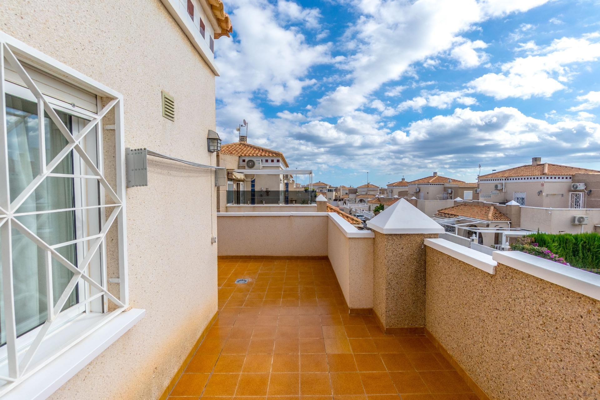 Attractive townhouse in the popular area Altos de la Bahía, Aguas Nuevas. just 1,7 km from La Mata beach. The property has four bedrooms and two bathrooms. 47 m2 terrace, and a 19 m² solarium which faces south. The community features a beautiful swimming pool, ideal for relaxing on sunny days.~~Sold furnished!~~Walking distance to beach, shops and restaurants. A perfect holiday home or year-round residence.~
