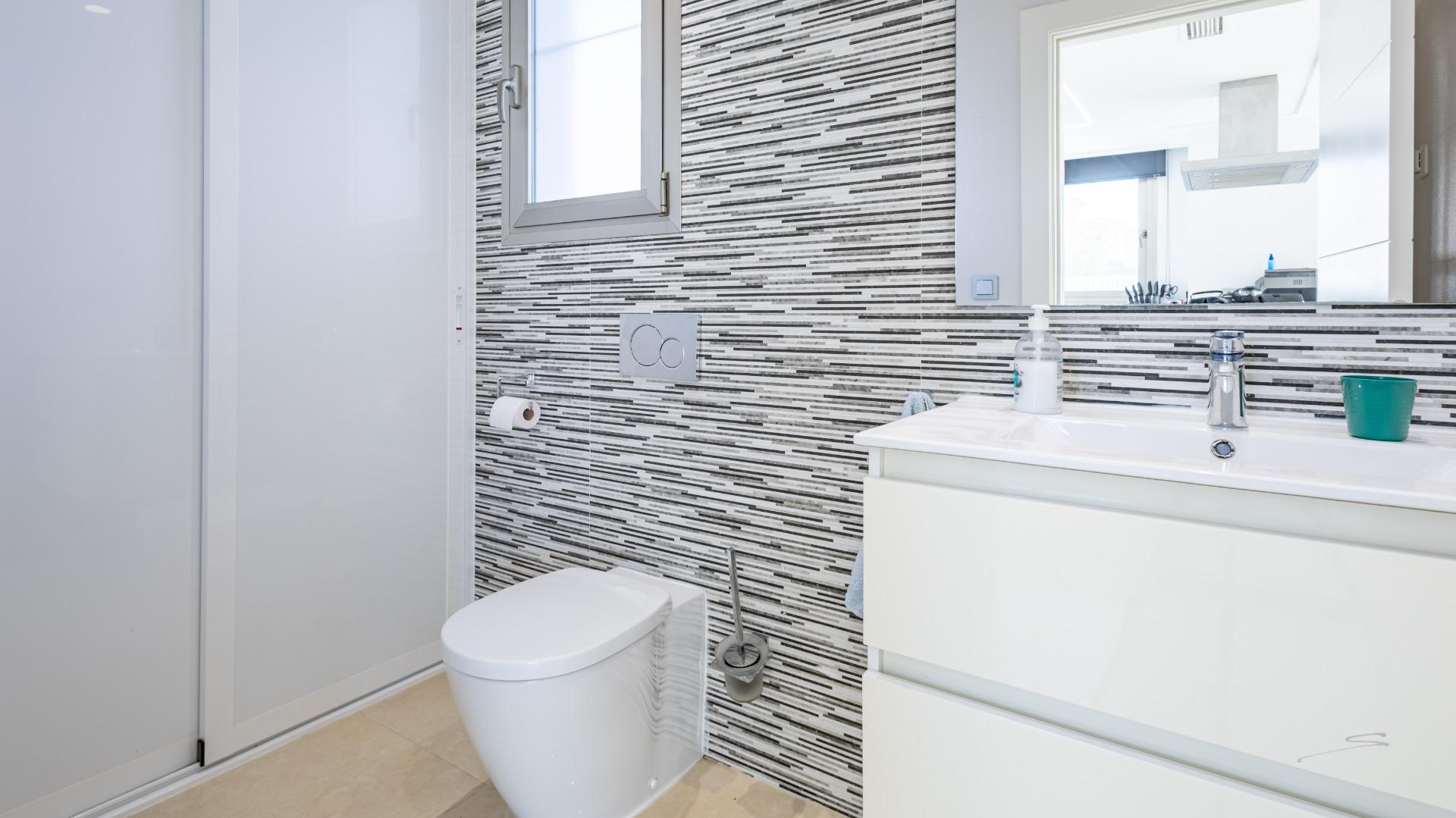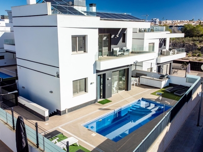Welcome to this spectacular independent and fully energy-self-sufficient villa in Orihuela Costa, located just 4 km from the beaches and very close to the renowned La Zenia Boulevard shopping centre. Built in 2019 and practically unused, you will have the privilege of enjoying a home that is almost brand new and lacks absolutely nothing. Upon arrival, you are greeted by an electric entrance gate with video intercom, offering comfort and security from the moment you enter. You can park your car inside the plot and enjoy a fully paved garden that includes two cosy artificial grass areas perfect for sunbathing. The private pool, featuring an elegant waterfall, allows you to cool off during the hottest summer days, while the perimeter fencing combines iron and tempered glass for a modern and exclusive touch.~~The villa also features a fully equipped outdoor kitchen, ideal for enjoying the Mediterranean climate almost all year round. Stepping inside, you will notice the solid entrance door, which ensures maximum security for your home and family. The living room and kitchen stand out for their impressive natural light, creating spacious, comfortable and inviting areas. All windows have mosquito screens, and the living room includes a pellet stove that provides warmth during the winter months. The interior kitchen has a modern style with clean lines and ample storage capacity, equipped with an oven, microwave, dishwasher and a large American-style refrigerator. On this same floor there is a guest toilet that also houses the washer-dryer and water heater.~~Descending to the semi-basement, you will find a large space currently set up with a bar for preparing cocktails, though it can be adapted for any use according to your needs. This level includes two very spacious bedrooms, each with its own private bathroom, as well as a small storage room. The floor benefits from excellent insulation thanks to a one-metre-wide chamber surrounding the entire semi-basement, also ideal for additional storage. On the upper floor, there are two more bedrooms, each with an en-suite bathroom, along with an area used as a wardrobe or storage space. Both bedrooms provide access to a large terrace of approximately 30 m², perfect for enjoying the sun and tranquillity.~~Finally, the solarium is equipped with solar panels that make this wonderful house completely energy-independent, thanks to a high-capacity photovoltaic installation with batteries. In summary, this villa offers modernity, quality, design and efficiency in a privileged Mediterranean setting. If you are looking for a move-in-ready home, equipped down to the last detail and designed for maximum comfort, look no further: this is your home.~