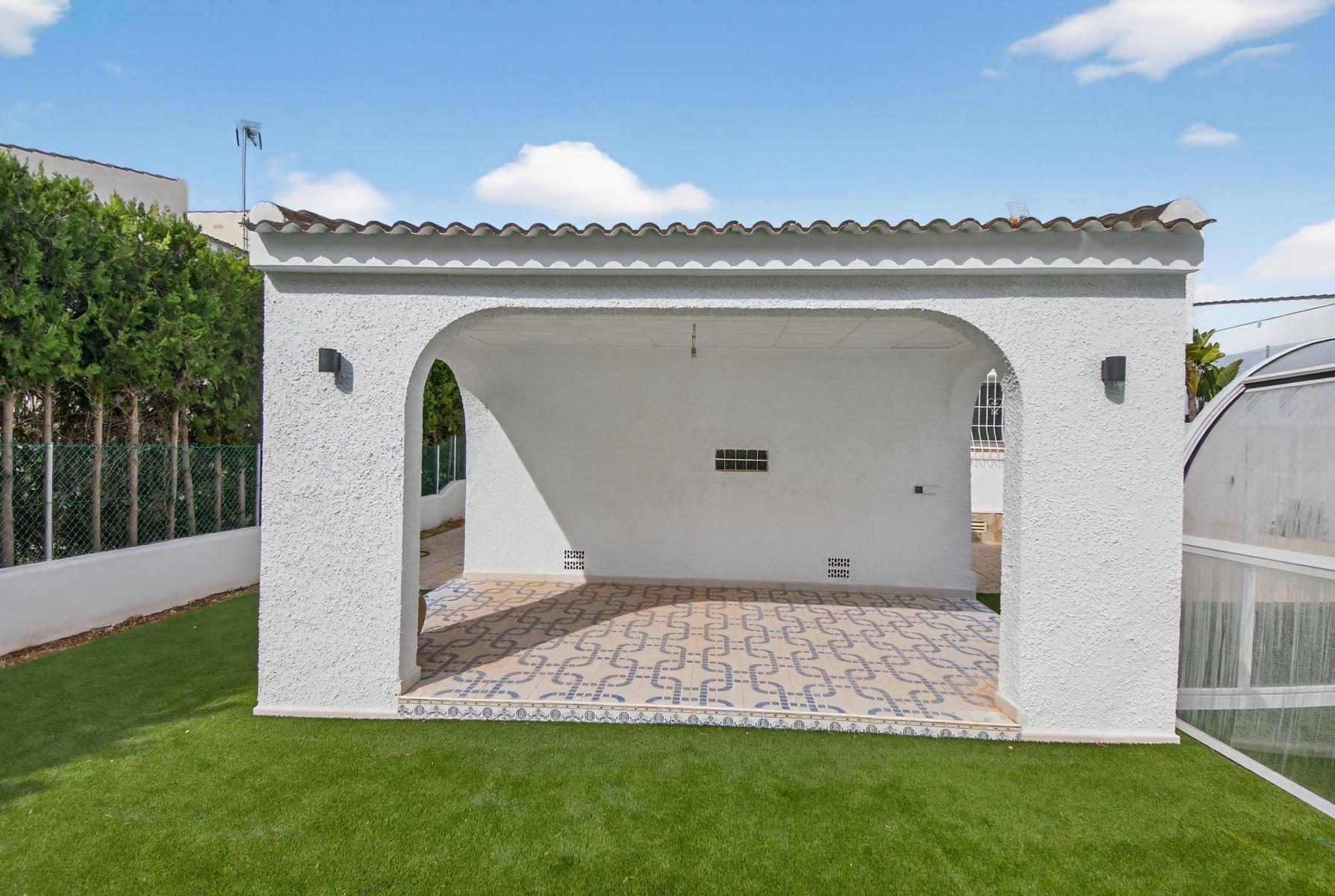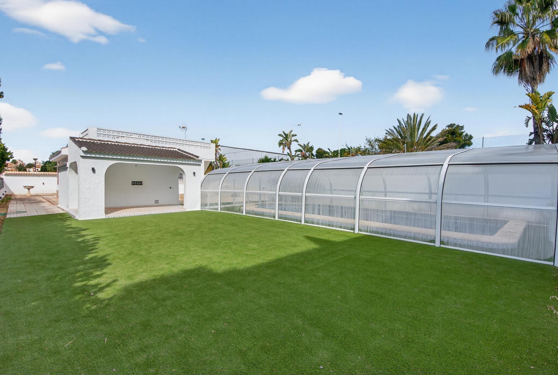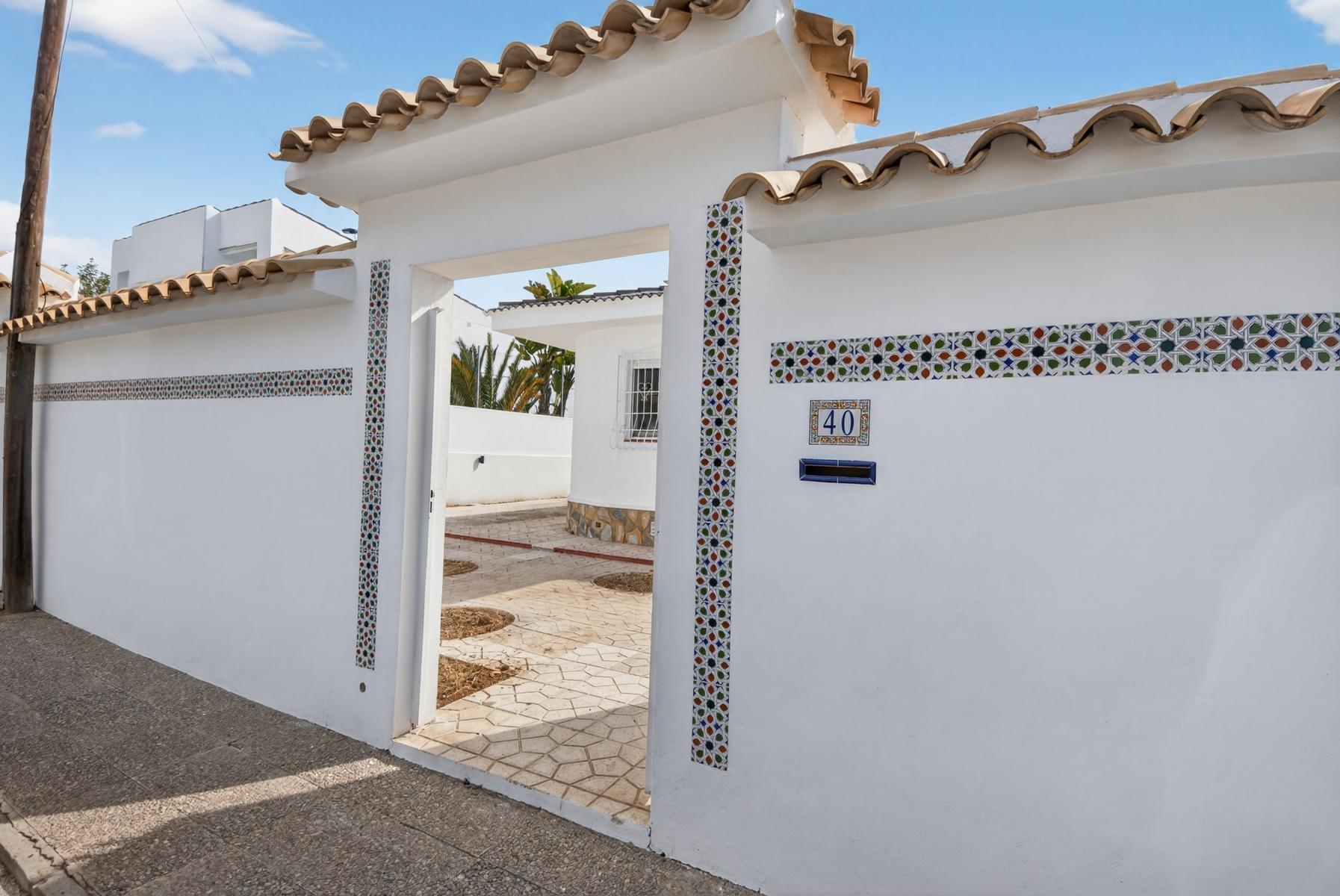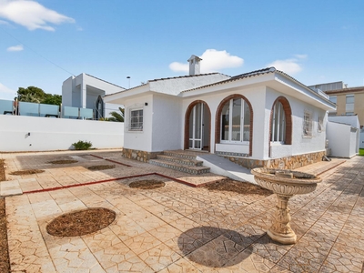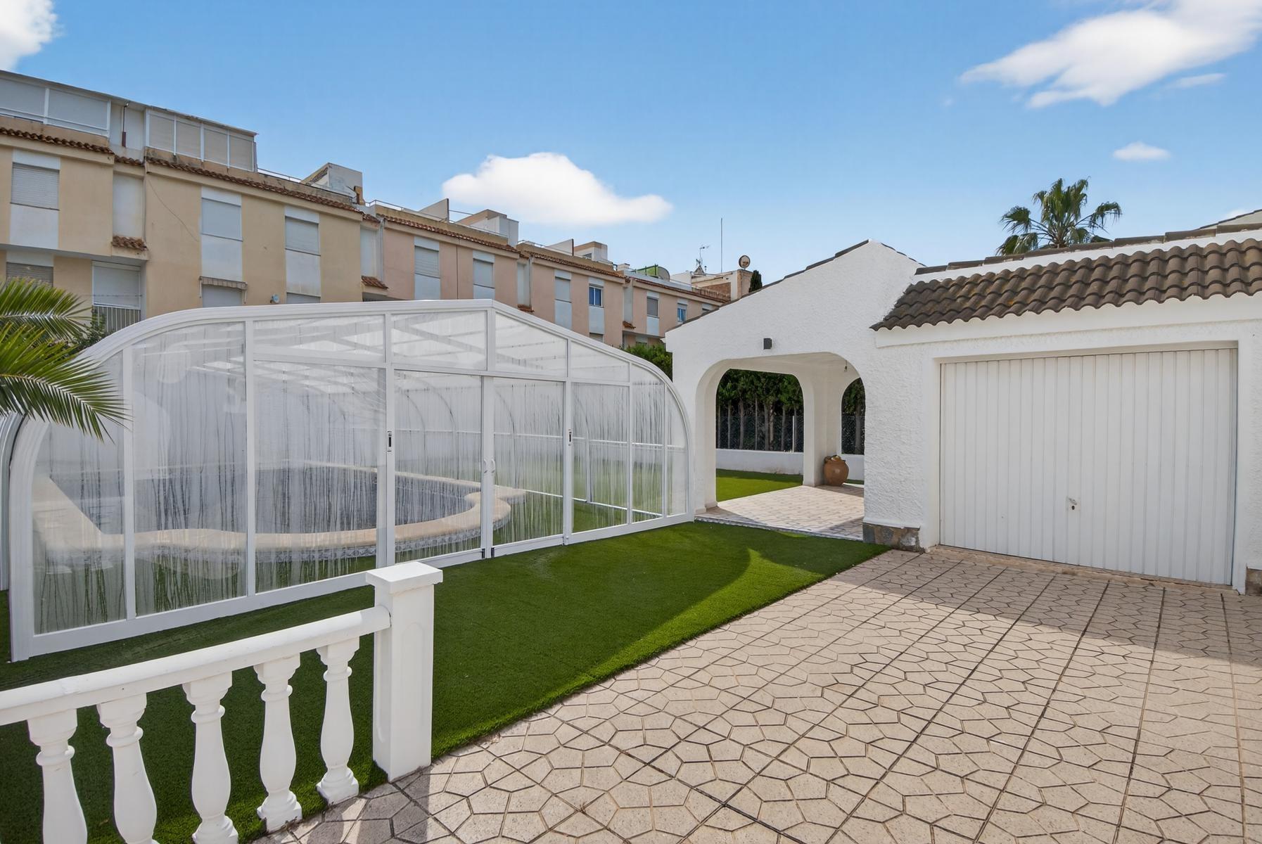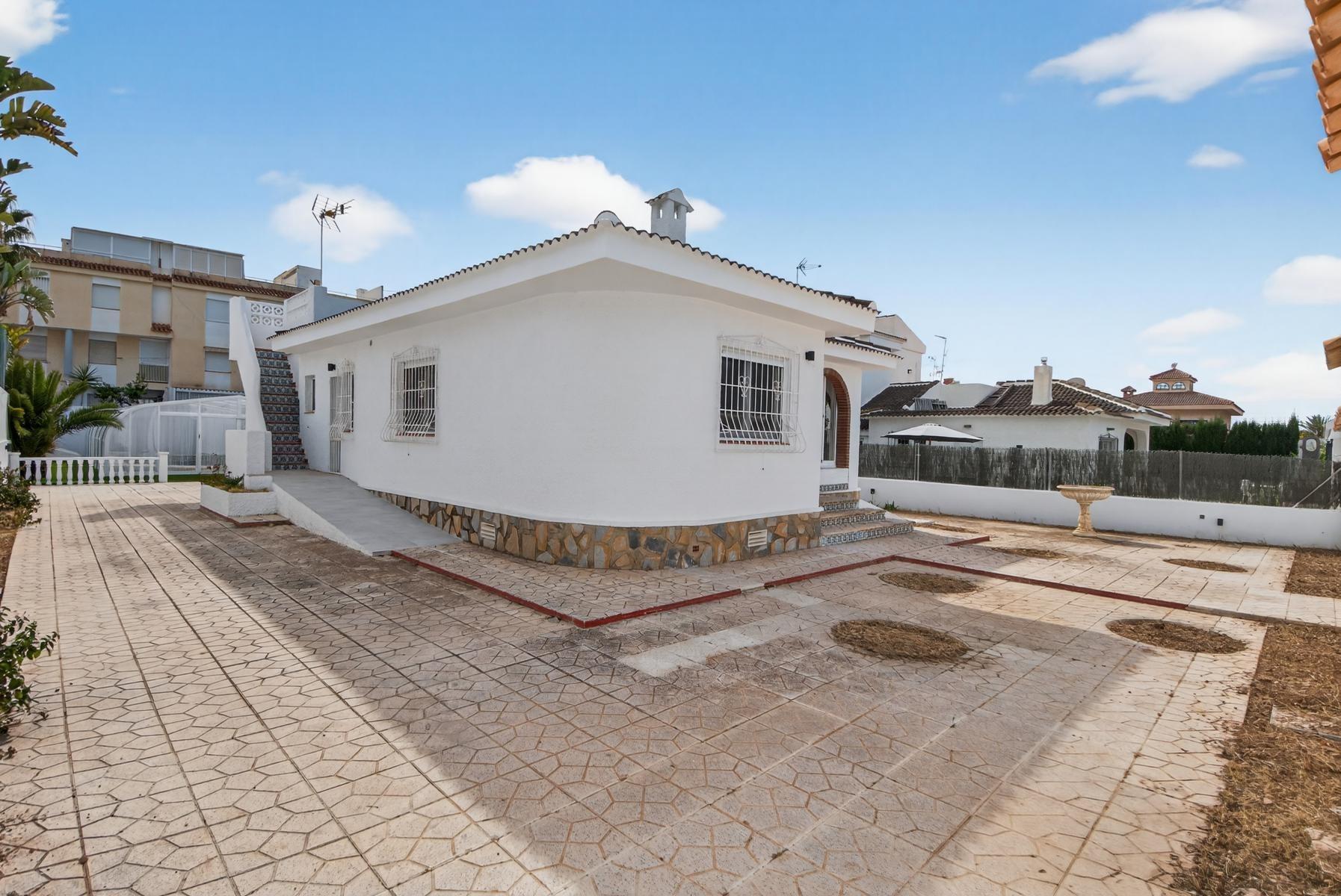 Exclusivo Chalet independiente de estilo mediterráneo ubicado en una amplia parcela de 757m², con un interior completamente reformado en estilo moderno y materiales de buena calidad. Uno de sus grandes valores es que se desarrolla íntegramente en una sola planta, ofreciendo máxima comodidad y funcionalidad con todas las estancias en el mismo nivel.~~La vivienda cuenta con 3 dormitorios y 2 baños, cocina independiente equipada y un amplio salón-comedor con chimenea, creando un espacio acogedor y práctico tanto para el día a día como para estancias prolongadas. Su orientación múltiple permite disfrutar de abundante luz natural durante todo el día, aportando una sensación constante de calidez y bienestar.~~En el exterior, la propiedad está diseñada para disfrutar sin complicaciones, con piscina privada cubierta, zonas de jardín con césped artificial, áreas embaldosadas, porche cubierto ideal para comidas al aire libre y garaje cerrado. Además, dispone de un solárium privado, que añade un espacio extra versátil para relax o uso social.~~Ubicada a menos de 1 km del mar y la playa, y cerca de supermercados, colegios, hospital y todo tipo de servicios, se encuentra en una zona altamente demandada tanto por clientes nacionales como internacionales, valorada por su cercanía al mar y su ambiente tranquilo.~~Se trata de una propiedad que destaca por su equilibrio entre espacio, privacidad, comodidad y ubicación, ideal para quienes buscan una vivienda principal confortable o una segunda residencia de calidad en la costa.~~Contáctanos para más información o para concertar una visita privada.~