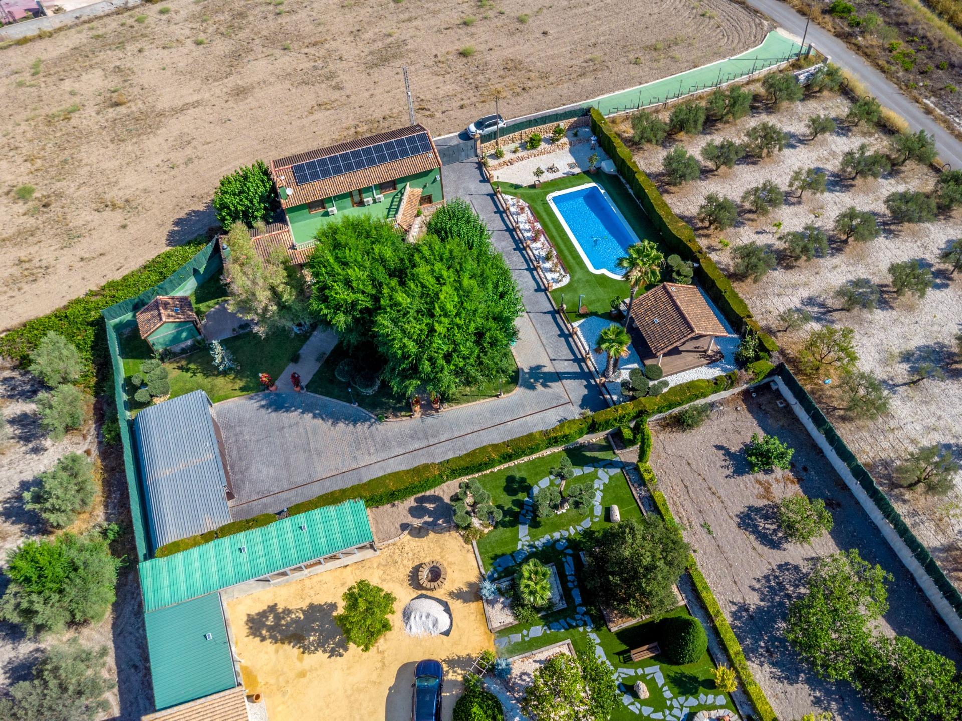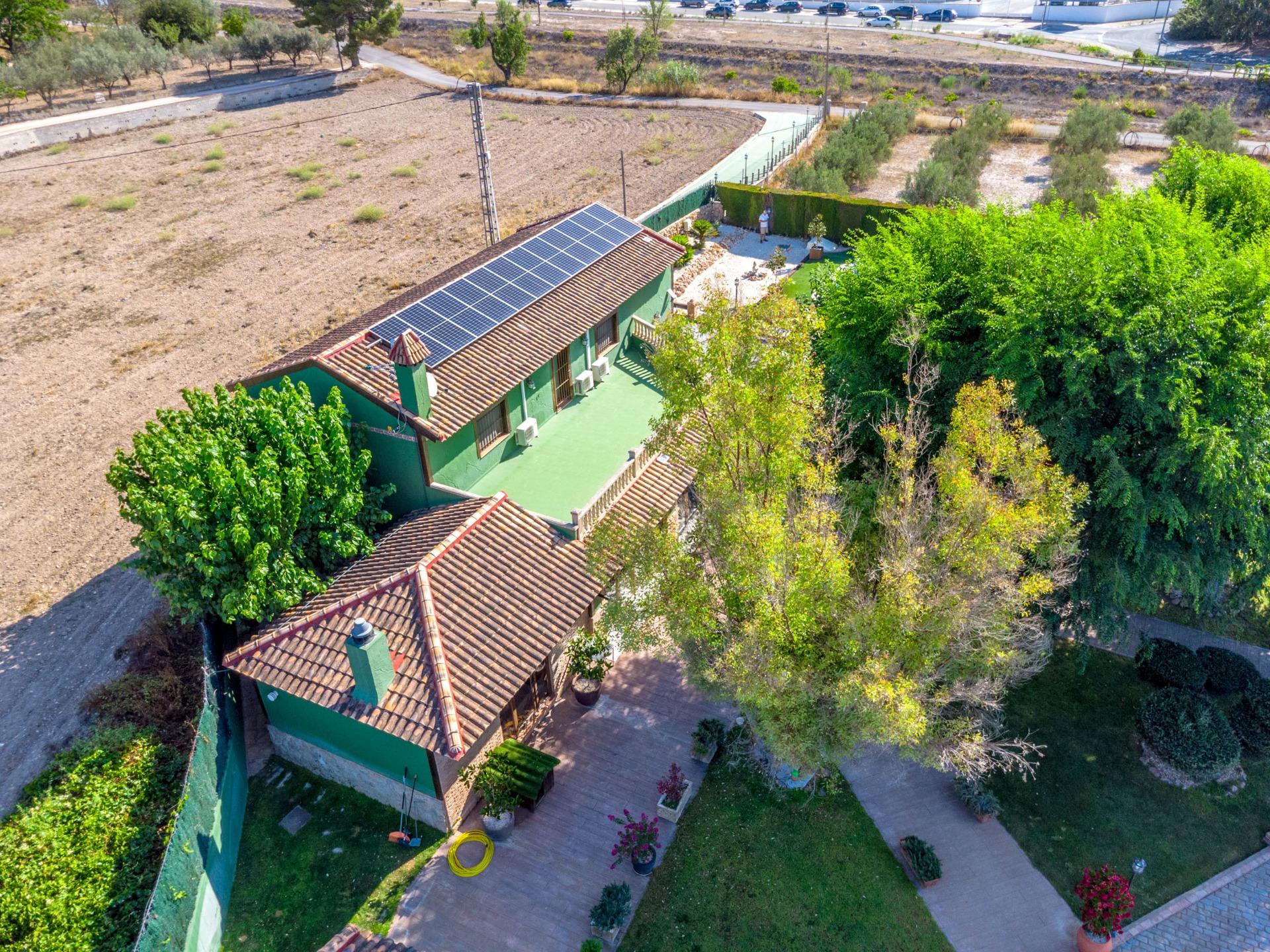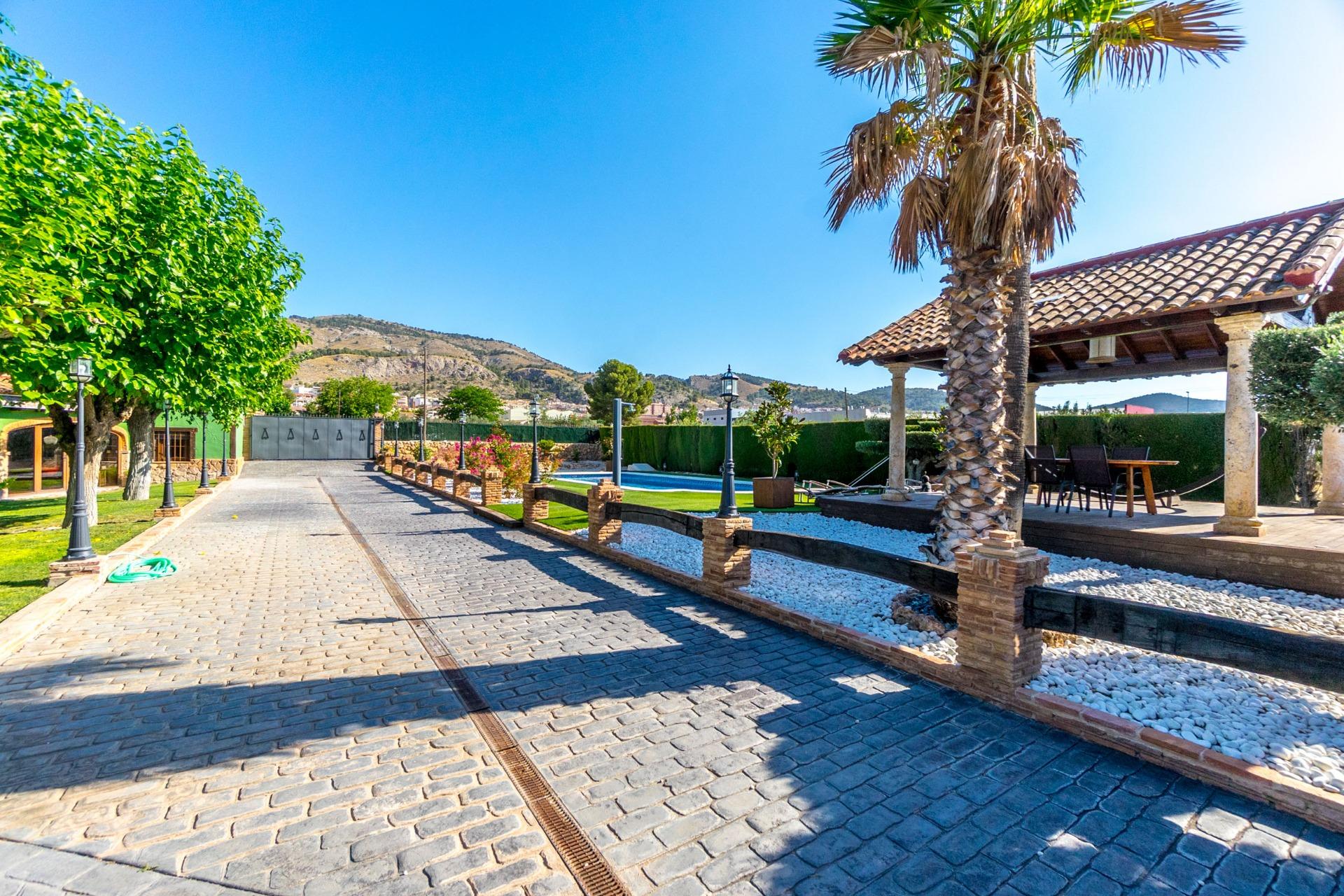 Chalet exclusivo en Onil, situado en una parcela de 5.968 m² dividida en dos zonas bien diferenciadas y completamente vallada con cámaras de seguridad, ideal para quienes buscan privacidad, confort y posibilidades de ocio.~~ZONA RESIDENCIAL (1.700 M²)~Aquí se ubica la vivienda principal que cuenta con una gran piscina privada con un porche de obra elegante y aparcamiento exterior para hasta 4 vehículos. También incluye dos pozos de agua para riego, combinando comodidad y eficiencia. La vivienda se distribuye en:~•PLANTA BAJA: Dos salones (uno interior amplio y luminoso, y otro exterior con grandes cristaleras mirando al jardín, el salón cuenta con una gran barbacoa. Entrando al salón interior tenemos una cocina con galería y un baño completo.~•PLANTA SUPERIOR: Cuatro dormitorios, dos baños y una gran terraza con vistas despejadas al entorno.~JARDÍN ORIENTAL (4.268 M²)~~Un espacio con personalidad propia, con pérgolas de madera, senderos para pasear, rincones decorados con estatuas, plantas orientales y elementos decorativos. Incluye un almacén que puede habilitarse como casa de invitados o zona de recreo. Este jardín es ideal para organizar eventos, disfrutar de la tranquilidad o desarrollar proyectos al aire libre.~~CONFORT Y EFICIENCIA~El chalet está listo para vivir todo el año, equipado con calefacción por gasoil y placas solares, combinando confort y sostenibilidad.~~UBICACIÓN~A menos de 700 metros del centro de Onil, un pueblo con encanto en la comarca de l’Alcoià, conocido por su tradición en la fabricación de juguetes, sus festivales locales y su entorno natural cercano a la sierra. Onil ofrece un clima mediterráneo con inviernos suaves y muy raramente nieva, lo que permite disfrutar de la vivienda durante todo el año.~Una propiedad única para quienes buscan un hogar con carácter, privacidad y amplias posibilidades de disfrute.~