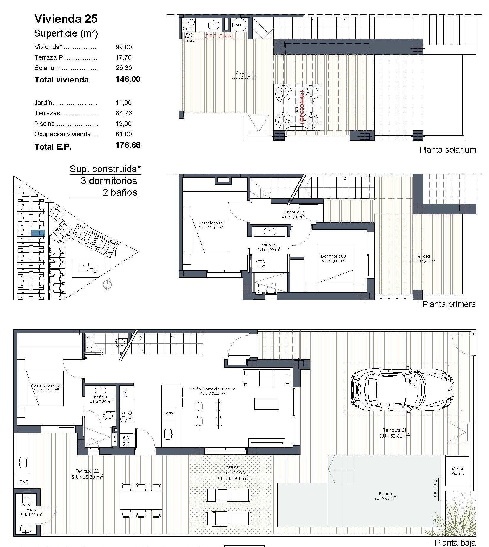 Villas de nueva construcción con piscina privada en Serena Golf-Los Alcázares~~Colección boutique de viviendas modernas cerca del mar~Descubra una exclusiva promoción boutique de 37 modernas villas adosadas y pareadas situadas en La Serena Golf, en Los Alcázares, en la hermosa Costa Cálida. Estas viviendas contemporáneas están diseñadas para compradores que buscan privacidad, sol y un estilo de vida al aire libre a solo 300 metros de las cálidas aguas del Mar Menor.~~Los Alcázares es una encantadora localidad costera conocida por su largo paseo marítimo, sus playas de arena y su relajado ambiente mediterráneo. La zona disfruta de más de 300 días de sol al año y ofrece excelentes restaurantes, tiendas, puertos deportivos e instalaciones deportivas. Su ubicación entre el mar y el campo de golf la convierte en uno de los destinos más deseados de la región, tanto para vivir como para pasar las vacaciones.~~Villas modernas con piscina privada y vida al aire libre~Cada propiedad cuenta con una parcela privada con su propia piscina, lo que crea el entorno perfecto para disfrutar del clima mediterráneo durante todo el año. Las viviendas incluyen 3 dormitorios y 2 o 3 baños, además de aseos para invitados, lo que ofrece espacios cómodos y funcionales, ideales para familias o invitados.~~Las villas están diseñadas para enfatizar la vida al aire libre. Junto a la piscina hay una zona de barbacoa y un aseo exterior para invitados, perfecto para recibir a amigos y familiares. El solárium de la azotea ofrece un espacio adicional para relajarse al sol e incluye una ducha solar con preinstalación para un jacuzzi y una cocina de verano.~~El aparcamiento está incluido tanto dentro de la parcela privada como con una plaza de aparcamiento subterráneo asignada.~~Acabados de alta calidad y características modernas~Las viviendas están construidas con materiales modernos y especificaciones de calidad diseñadas para ofrecer comodidad y estilo.~~Cocina totalmente equipada con electrodomésticos en acabado de cristal blanco~Baños con espejos retroiluminados, mamparas de ducha y tocadores~Persianas motorizadas~Paquete básico de iluminación~Aire acondicionado por conductos totalmente instalado~~Estas características garantizan una experiencia de vida cómoda, tanto si la propiedad se utiliza como residencia principal como si se utiliza como casa de vacaciones.~~Servicios estilo resort y excelente ubicación~Los propietarios también disfrutan de acceso a instalaciones compartidas estilo resort con una urbanización vecina. Estas instalaciones incluyen jardines paisajísticos, una piscina comunitaria estilo laguna, zona de spa, gimnasio y sauna.~~La ubicación ofrece fácil acceso a playas, campos de golf y ciudades cercanas.~~Playa del Mar Menor a 0,3 km~Campo de golf La Serena junto a la urbanización~Centro de Los Alcázares a 2 km~Cartagena a 22 km~Murcia a 40 km~Aeropuerto Internacional de la Región de Murcia a 30 km~Aeropuerto de Alicante-Elche a 90 km~~Las aguas poco profundas del Mar Menor son perfectas para nadar, navegar, practicar paddle surf y otros deportes acuáticos durante todo el año.~~Asegúrese un estilo de vida mediterráneo en Los Alcázares~Estas villas de nueva construcción ofrecen la combinación perfecta de playa, golf y comodidad moderna en la Costa Cálida. Póngase en contacto con nosotros hoy mismo para recibir más información o concertar una visita y asegurarse su nueva vivienda en Serena Golf, en Los Alcázares.~